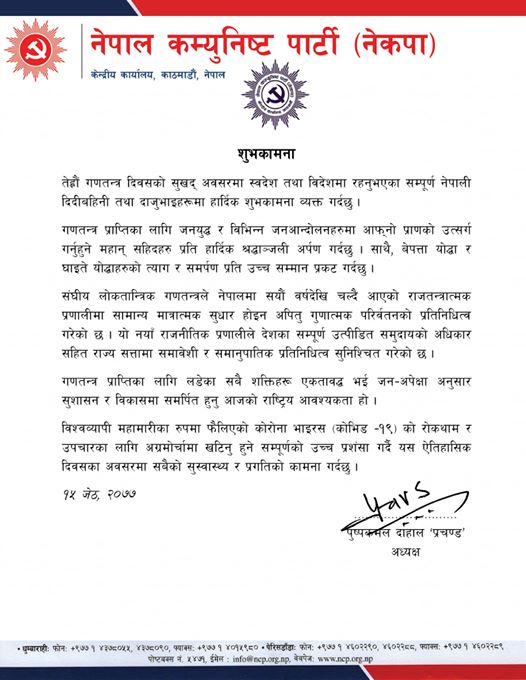 “संघीय लोकतान्त्रिक गणतन्त्रले नेपालमा सयौं वर्षदेखि चल्दै आएको राजतन्त्रात्मक प्रणालीमा सामान्य मात्रात्मक सुधार होइन अपितु गुणात्मक परिर्वतनको प्रतिनिधित्व गरेको छ । यो नयाँ राजनीतिक प्रणालीले देशका सम्पूर्ण उत्पीडित समुदायको अधिकारसहित राज्य सत्तामा समावेशी र समानुपातिक प्रतिनिधित्व सुनिश्चित गरेको छ” शुभकामनामा भनिएको छ ।