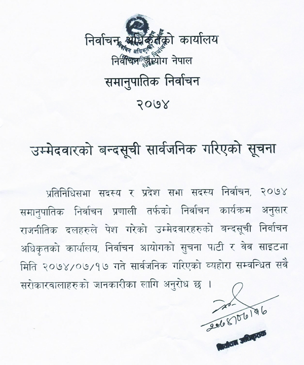 प्रमुख दलहरुले आयोगमा बुझाएको समानुपातिक निर्वाचनतर्फको बन्दसूची आयोगले शुक्रबार साँझ सार्वजनिक गरेको हो ।