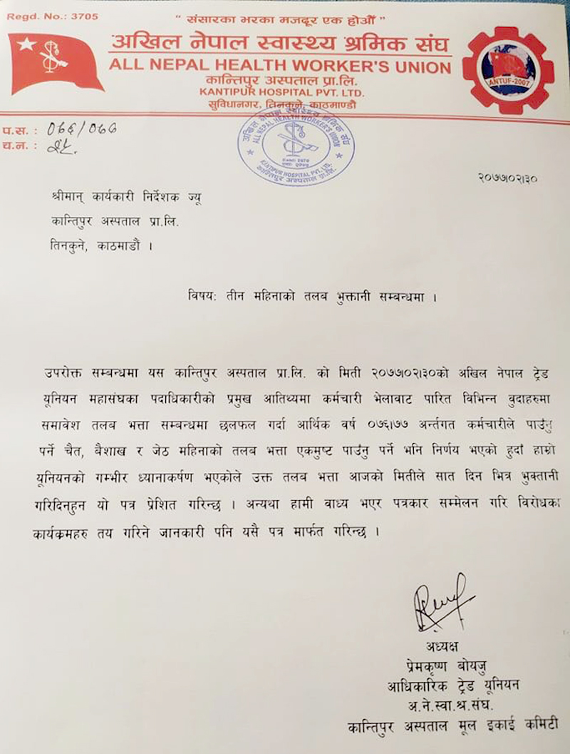 आधिकारिक ट्रेड युनियन, अखिल नेपाल स्वास्थ्य श्रमिक संघ कान्तिपुर अस्पताल मूल इकाई कमिटीका अध्यक्ष प्रेमकृष्ण बोयजुले बैठकपछि अस्पतालका कार्यकारी निर्देशकलाई तीन महिनाको तलब भुक्तानीसम्बन्धी पत्र लेखेर ३ महिना (चैत, बैशाख र जेठ)को तलब भत्ता एकमुष्ट पाउनु पर्ने भनी ध्यानाकर्षण समेत गराएका छन् ।