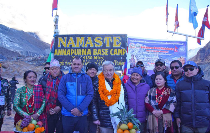 चारदिने नेपाल भ्रमणमा रहेका संयुक्त राष्ट्रसंघका महासचिव गुटेरेसले आज बिहानै नेपाली सेनाको हेलिकप्टरमा अन्नपूर्ण बेसक्याम्प पुगेर भिडियो सन्देश रेकर्ड गराएका हुन् ।