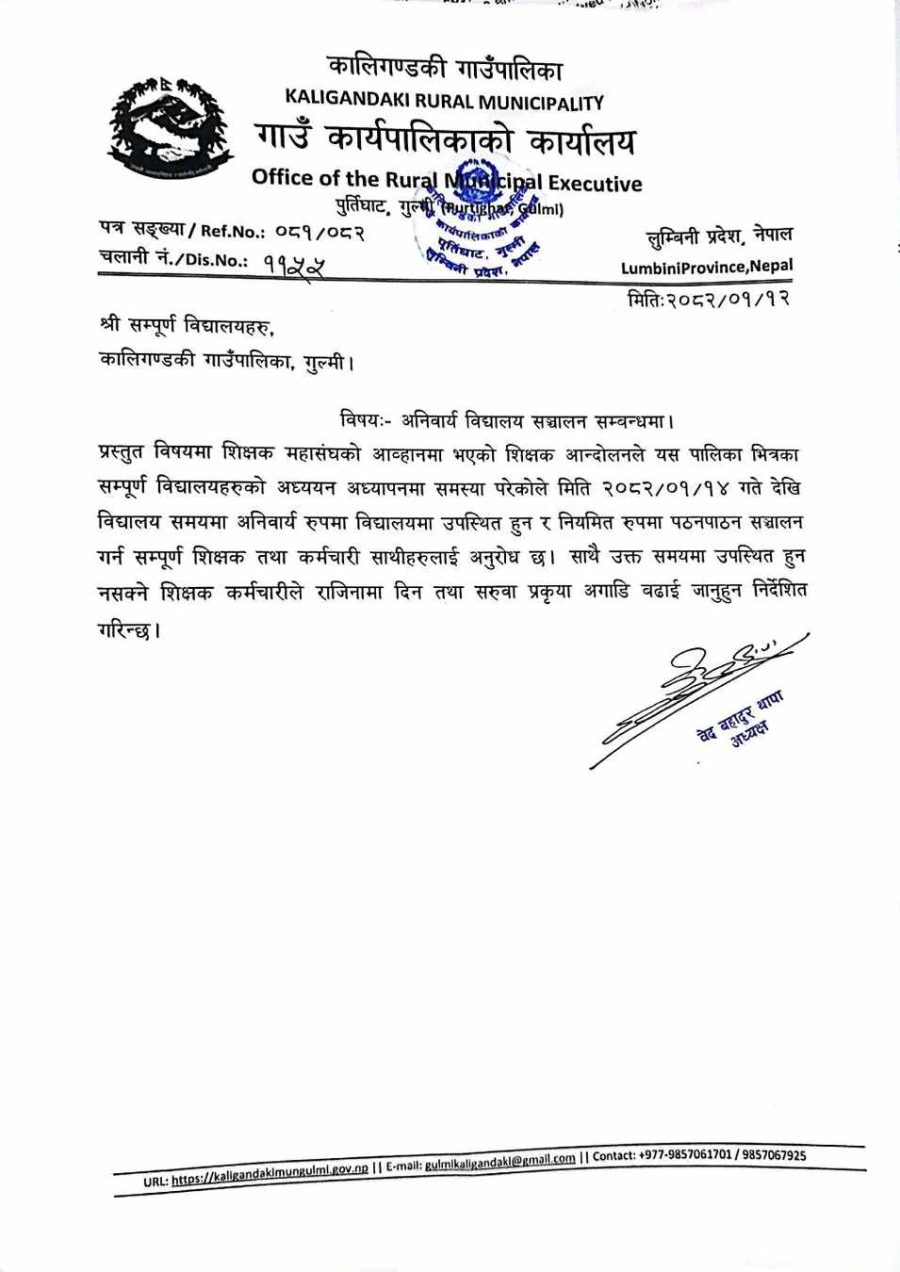 १३ बैशाख ०८२, गुल्मी । जिल्लाको कालीगण्डकी गाउँपालिकाले शिक्षक तथा कर्मचारीहरुलाई विद्यालयमा अनिवार्य उपस्थित भई पठनपाठन नियमित गर्न अनुरोध गरेको छ ।
