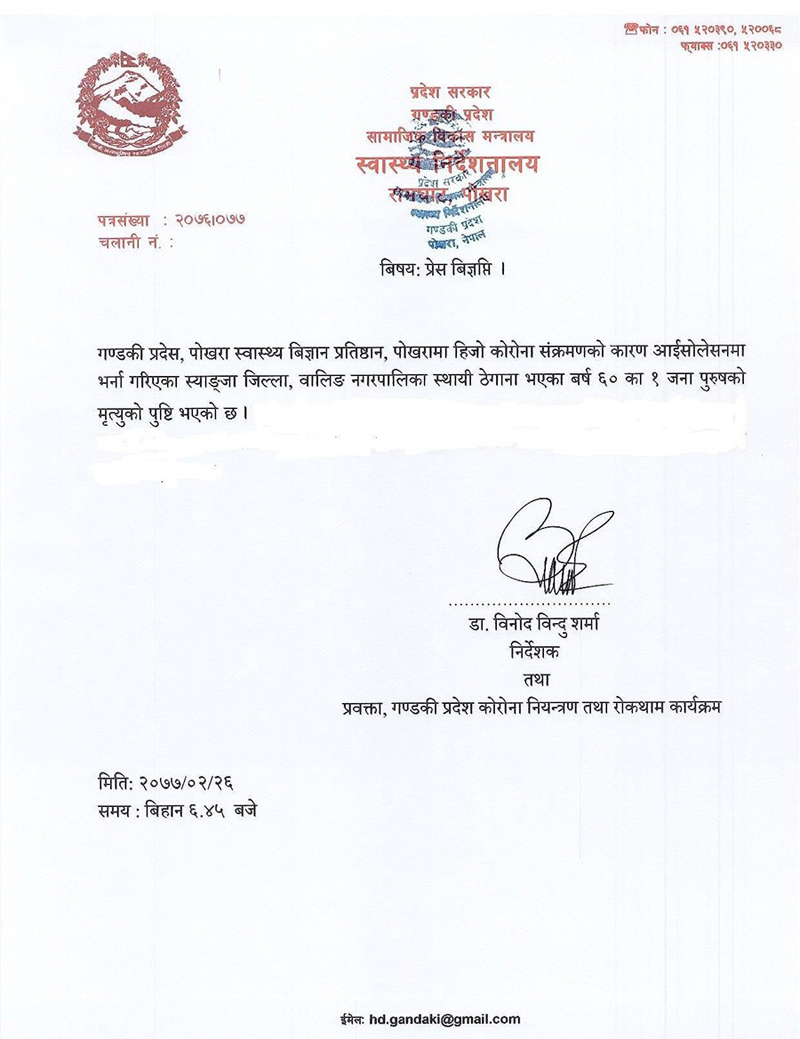 गण्डकी प्रदेश पोखरा स्वास्थ्य विज्ञान प्रतिष्ठानको आइसोलेसनमा उपचाररत स्याङ्जाको वालिङ निवासी भएका ६० वर्षीय पुरुषको मृत्यु भएको हो ।