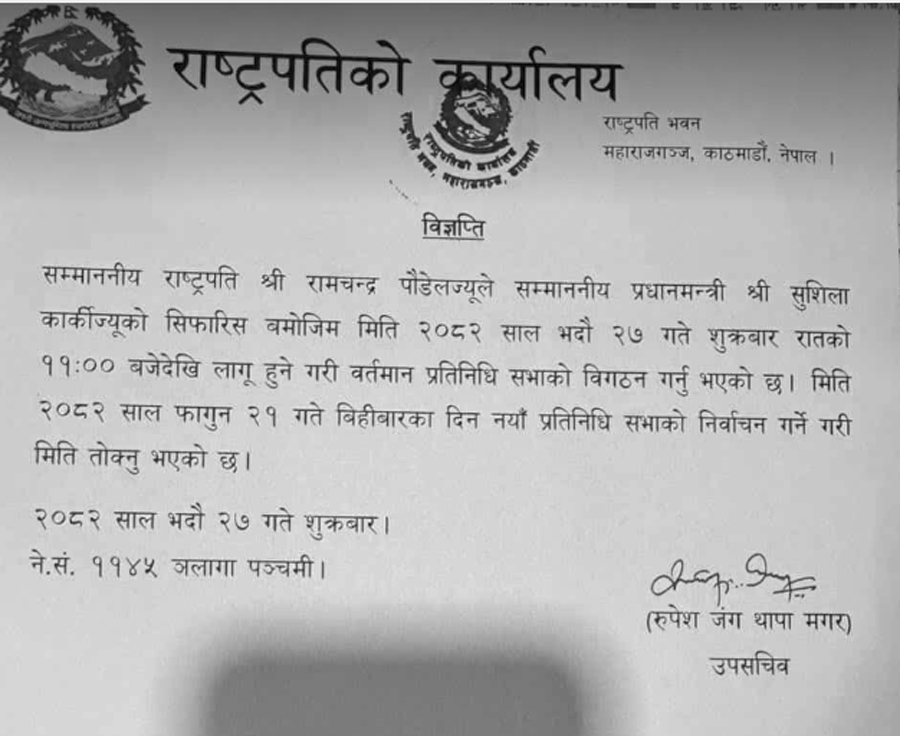 प्रधानमन्त्री कार्कीले प्रतिनिधिसभाको विगठन र २०८२ फागुन २१ गते प्रतिनिधिसभा निर्वाचन गर्ने भनी मिति सिफारिस गरिएकोमा राष्ट्रपति पौडेलले सदर गरेका छन् ।