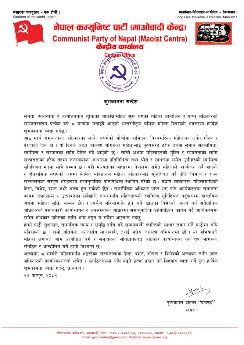 प्रत्येक वर्ष ८ मार्चमा मनाइँदै आएको अन्तर्राष्ट्रिय श्रमिक महिला दिवसको अवसरमा अध्यक्ष प्रचण्डले समता, स्वतन्त्रता र उत्पीडनबाट मुक्तिको आकांक्षासहित सुरू भएको महिला आन्दोलन र प्राप्त अधिकारको सम्मानस्वरूप शुभकामना सन्देश जारी गरेका हुन् ।