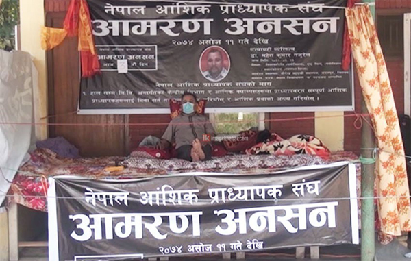 काठमाडौं । नेपाल आंशिक प्राध्यापक संघको आह्वानमा आमरण अनशन बसेका शिक्षक डा. महेश गजुरेलको स्वास्थ्य अवस्था कमजोर बन्दै गएको छ ।