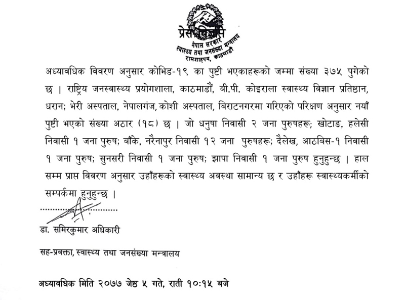 मन्त्रालयले सोमबार राती सवा १० बजे जारी गरेको प्रेस विज्ञप्तिमा राष्ट्रिय जनस्वास्थ्य प्रयोगशाला काठमाडौं, बी.पी. कोइराला स्वास्थ्य विज्ञान प्रतिष्ठानधरान, भेरी अस्पताल नेपालगंज, कोशी अस्पताल बिराटनगरमा गरिएको परीक्षण अनुसार नयाँ पुष्टी भएको संख्या अठार (१८) पुगेको जनाएको छ ।