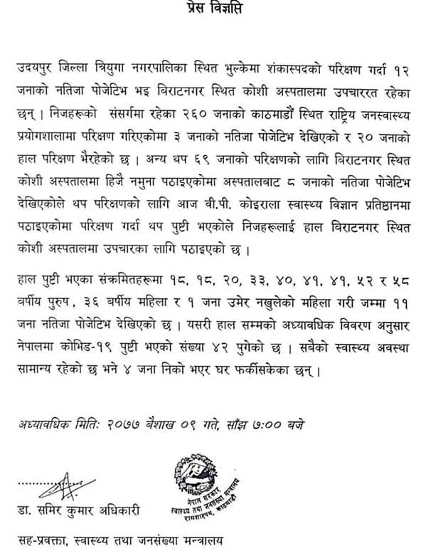 मन्त्रालयले उदयपुर जिल्ला त्रियुगा नगरपालिकास्थित भुल्केमा शंकास्पदको परीक्षण गर्दा १२ जनाको नतिजा पोजेटिभ भई विराटनगरस्थित कोशी अस्पतालमा उपचाररत् रहेका पनि बताएको छ ।