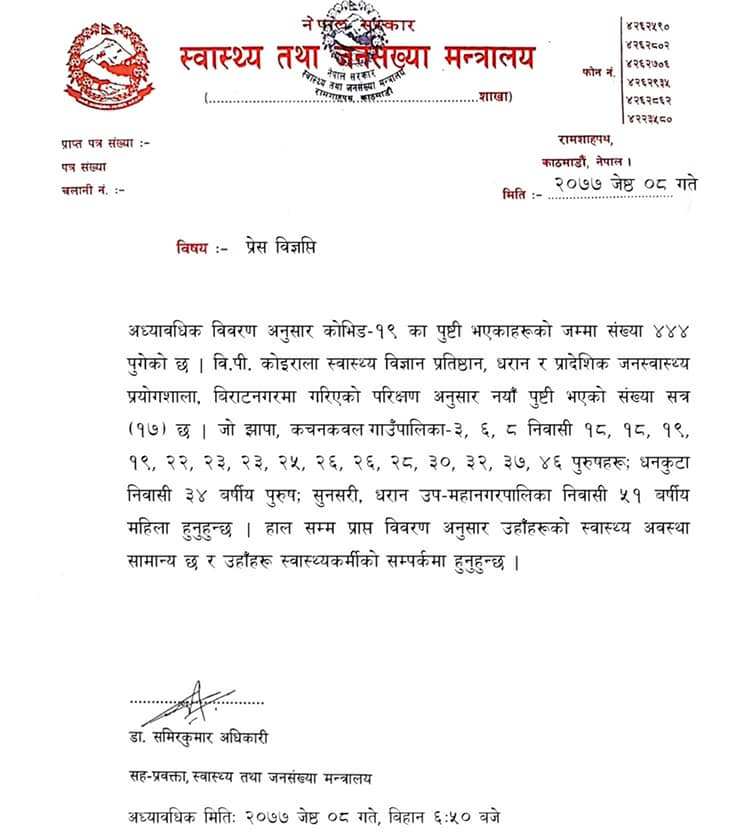 मन्त्रालयले बिहीबार बिहान १७ जना नयाँ संक्रमित थपिएको जनाएसँगै कोभिड–१९ पुष्टि भएकाहरूको कूल संख्या ४४४ पुगेको हो ।