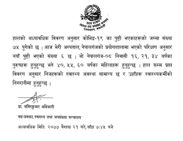 स्वास्थ्य मन्त्रालयले आज साँझ जारी गरेको विज्ञप्तिमा भेरी अस्पताल, नेपालगंजको प्रयोगशालामा भएको परीक्षण अनुसार नयाँ संक्रमित ६ जना थपिएसँगै कोरोना संक्रमित संख्या ७५ पुगेको हो ।