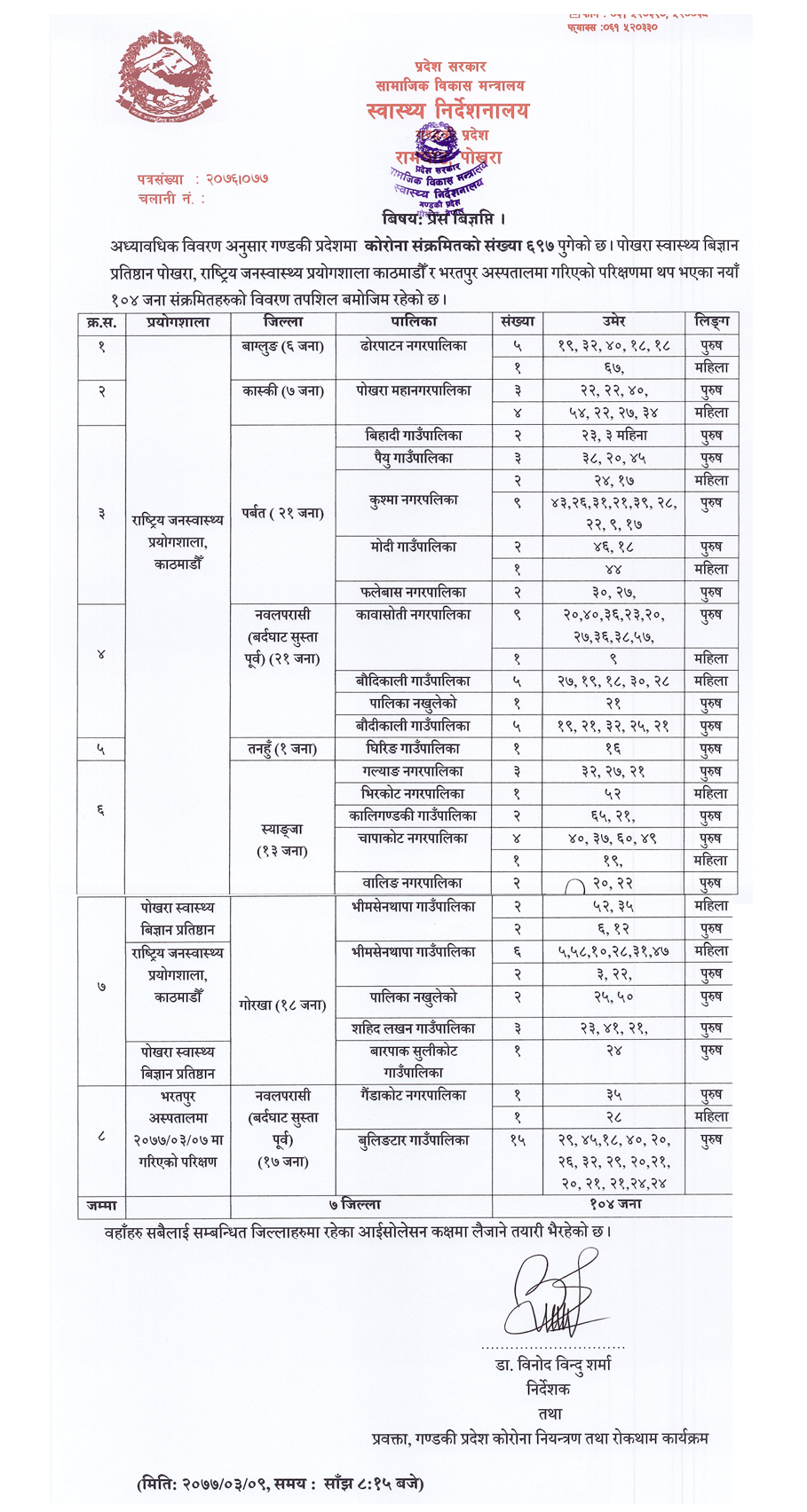 गण्डकी प्रदेशमा थप १ सय ४ जनामा कोरोना संक्रमण पुष्टि