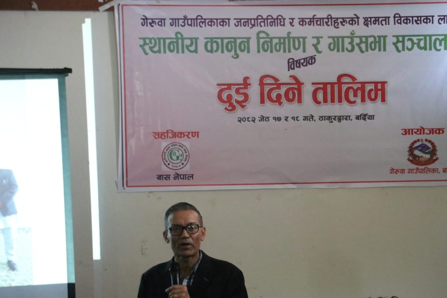 १८ जेठ ०८२, नेपालगञ्ज । गेरुवा गाँउपालिकाको आयोजना र वास नेपालको सहजीकरणमा पालिकाका जनप्रतिनिधिहरु र कर्मचारीहरुलाई स्थानीय कानुन निर्माण र गाँउ सभा सञ्चालन बिषयमा तालिम सम्पन्न भएको छ ।