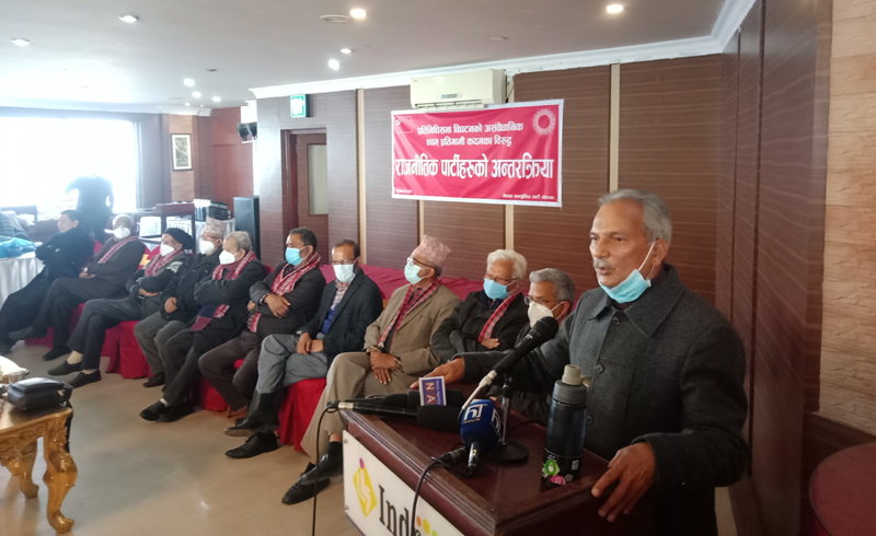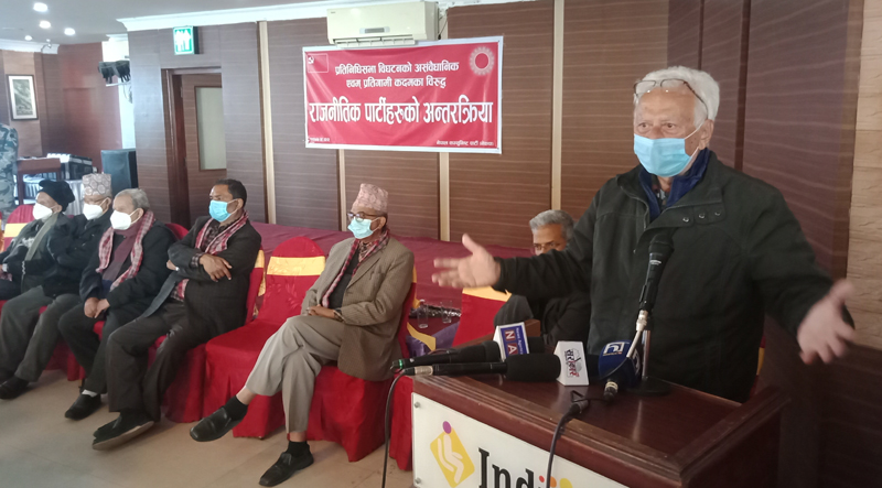 बुधबार नेकपाले नयाँ बानेश्वरस्थित इन्द्रेनी फुडल्याण्ड आयोजना गरेको प्रतिनिधिसभा विघटनको असंवैधानिक एवम् प्रतिगामी कदमका विरुद्ध राजनीतिक पार्टीहरुको अन्तरक्रिया कार्यक्रममा नेकपाका अध्यक्ष नेपालले यस्तो बताएका हुन् ।