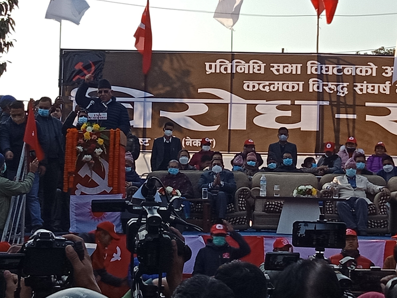 प्रधानमन्त्री केपी ओलीको सिफारिसमा यही पुस ५ गते राष्ट्रपति विद्यादेवी भण्डारी प्रतिनिधिसभाको विघटन गरिसकेपछि नेकपाले मंगलबार राजधानीमा आयोजना गरेको विरोध सभालाई सम्बोधन गर्दै अध्यक्ष प्रचण्डले यस्तो बताएका हुन् ।