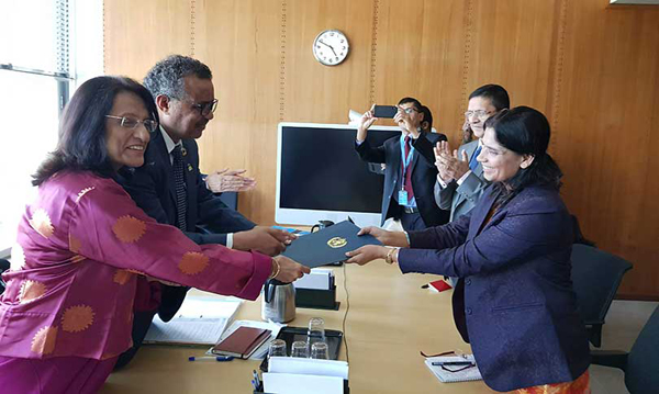 प्रतिनिधिमण्डलको नेतृत्व गर्दै जेनेभा पुगेकी स्वास्थ्य तथा जनसंख्या राज्यमन्त्री पद्मा अर्याल र विश्व स्वास्थ्य संगठनका महानिर्देशक डा. टेड्रोस अधानम देभ्रेयुस द्विपक्षीय छलफल भएको थियो ।
