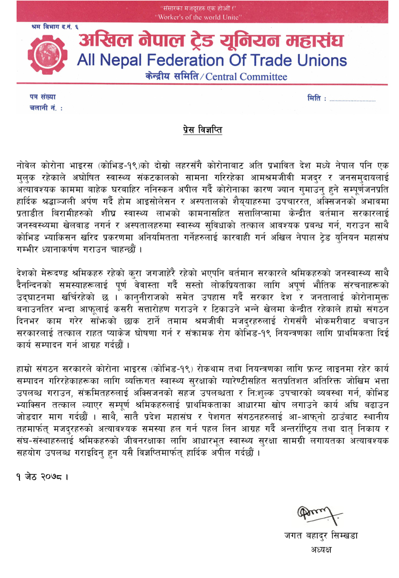 “सत्तालिप्सामा केन्द्रीत वर्तमान सरकारलाई जनस्वस्थ्यमा खेलवाड नगर्न र अस्पतालहरुमा स्वास्थ्य सुविधाको तत्काल आवश्यक प्रबन्ध गर्न, गराउन” महासंघका अध्यक्ष जगत सिम्खडाद्वारा हस्ताक्षरित विज्ञप्तिमा भनिएको छ, “श्रमजीवी मजदुरहरुलाई रोगसँगै भोकमरीबाट बचाउन सरकारलाई तत्काल राहत प्याकेज घोषणा गर्न र संक्रामक रोग कोभिड–१९ नियन्त्रणका लागि प्राथमिकता दिई कार्य सम्पादन गर्न आग्रह गर्दछौं ।”