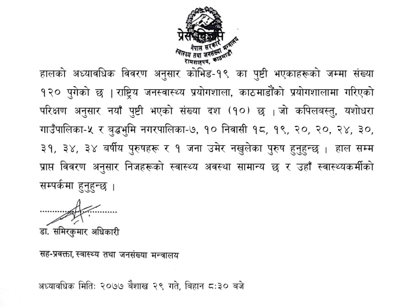 नयाँ संक्रमितहरु कपिलबस्तु, यशोधरा गाउँपालिका ५ र बुद्धभुमि नगरपालिका ७ , १० निवासी १८, १९, २०, २०, २४, ३०, ३१, ३४, ३४ वर्षीय पुरुषहरू र १ जना उमेर नखुलेका पुरुष रहेको मन्त्रालयले जनाएको छ । साथै, हालसम्म प्राप्त विवरण अनुसार निजहरूको स्वास्थ्य अवस्था सामान्य र स्वास्थ्यकर्मीको सम्पर्कमा रहेका छन् ।
