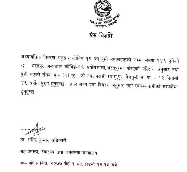 भरतपुर अस्पताल कोभिड–१९ प्रयोगशाला, भरतपुरमा गरिएको परीक्षणमा उनको रिर्पोट पोजेटिभ देखिएको स्वास्थ्य मन्त्रालयले योसँगै संक्रमितको संख्या २४६ पुगेको बताएको छ ।