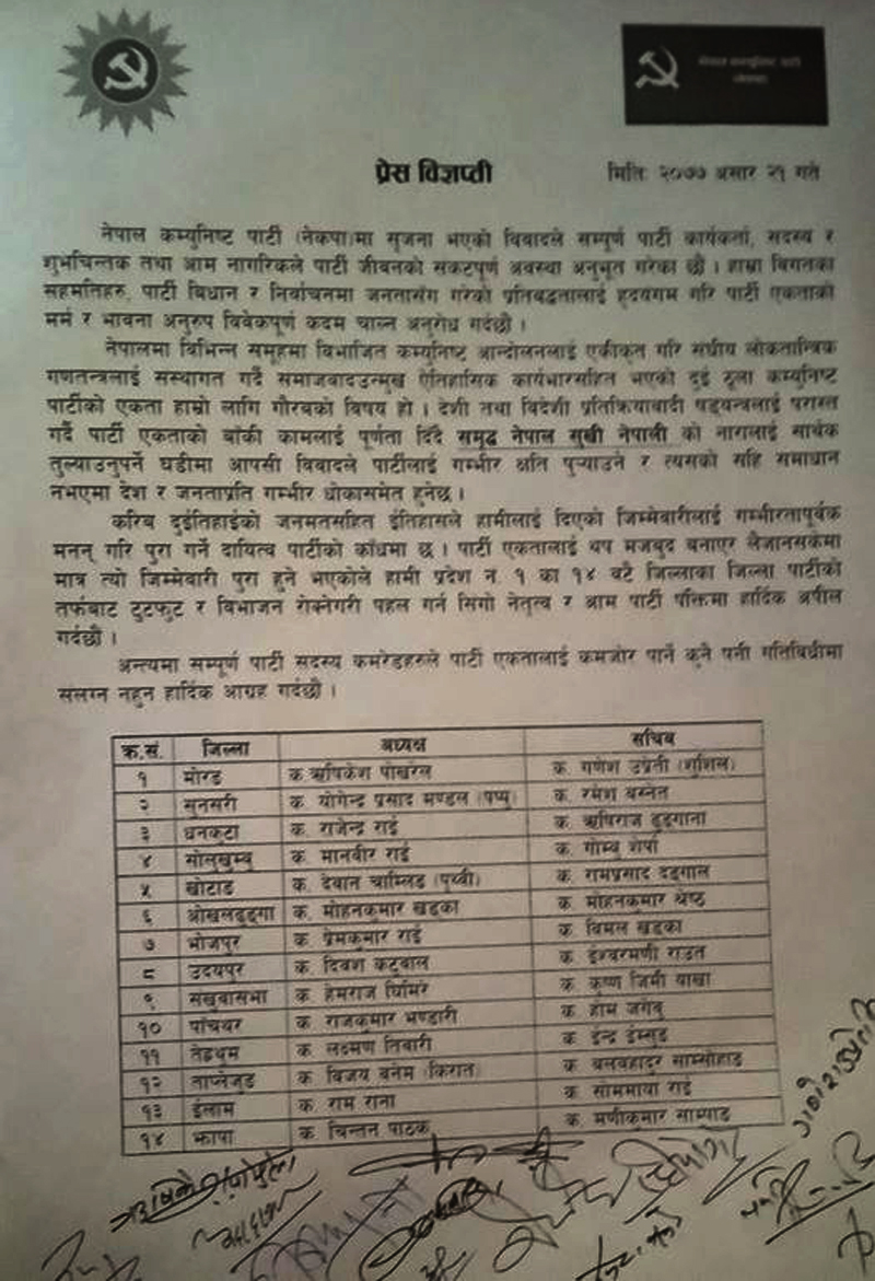 नेकपा प्रदेश १ का १४ वटै जिल्लाका अध्यक्ष र सचिवले पार्टी फुटे जनतामा गम्भीर धोका हुने बताउँदै वार्ताबाट समाधान खोज्न आग्रह गरेका छन् ।