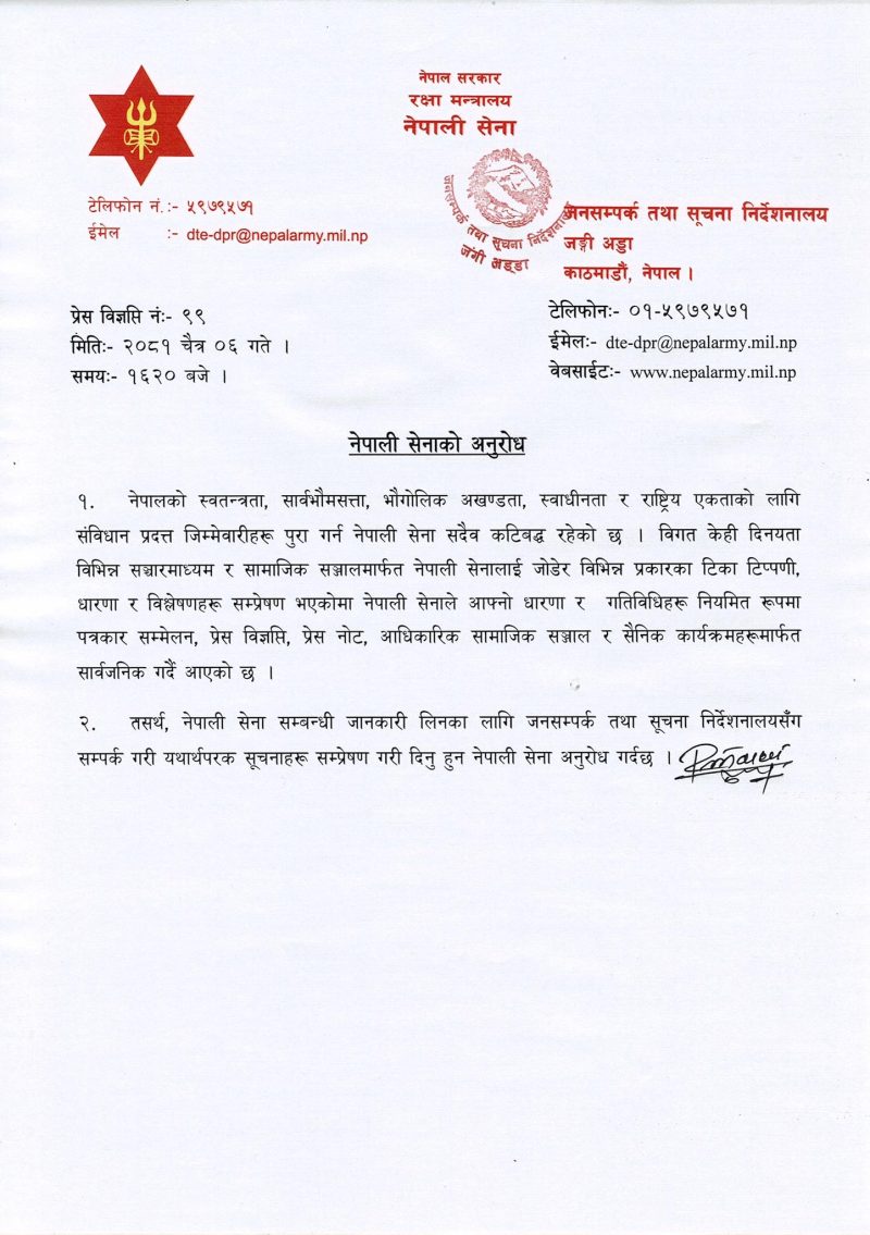 “विगत केही दिनयता विभिन्न सञ्चारमाध्यम र सामाजिक सञ्जालमार्फत् नेपाली सेनालाई जोडेर विभिन्न प्रकारका टिका टिप्पणी, धारणा र विश्लेषणहरू सम्प्रेषण भएकोमा नेपाली सेनाले आफ्नो धारणा र गतिविधिहरू नियमित रूपमा पत्रकार सम्मेलन, प्रेस विज्ञप्ति, प्रेस नोट, आधिकारिक सामाजिक सञ्जाल र सैनिक कार्यक्रमहरूमार्फत सार्वजनिक गर्दै आएको छ,” विज्ञप्तिमा भनिएको छ, “नेपालको स्वतन्त्रता, सार्वभौमसत्ता, भौगोलिक अखण्डता, स्वाधीनता र राष्ट्रिय एकताको लागि संविधान प्रदत्त जिम्मेवारीहरू पुरा गर्न नेपाली सेना सदैव कटिबद्ध रहेको छ ।”