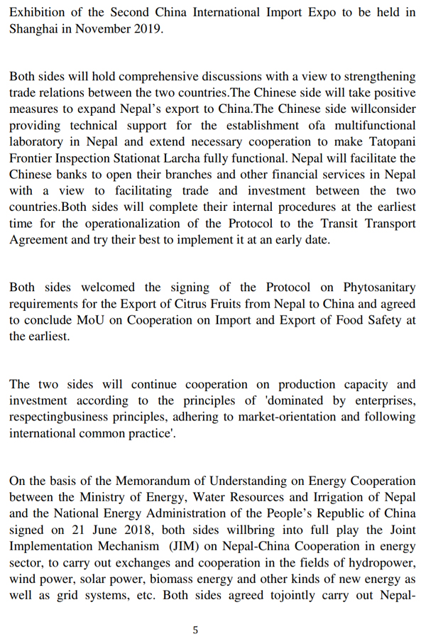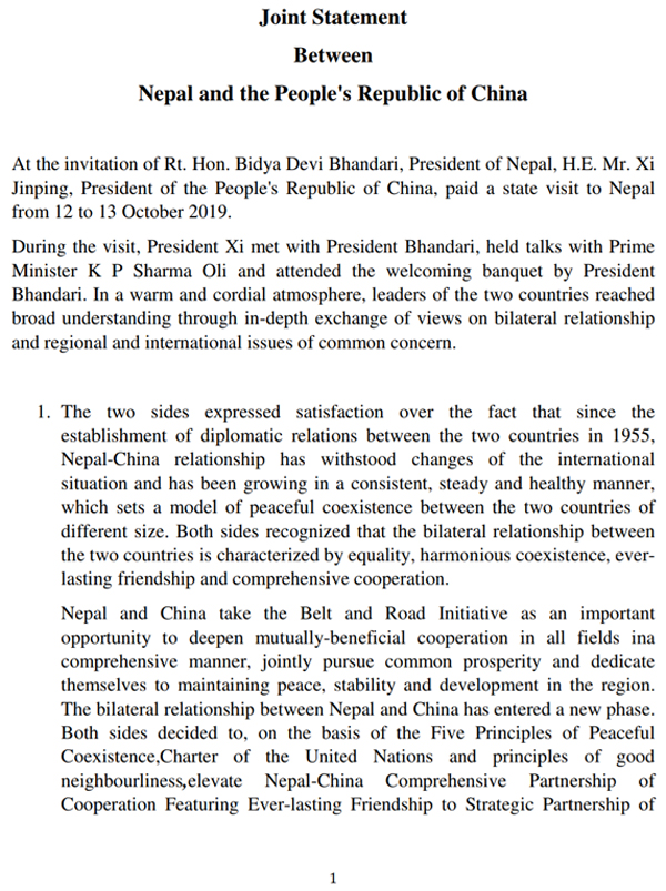 वक्तव्यमा नेपालका राष्ट्रपति विद्या देवी भण्डारीको निमन्त्रणामा जनवादी गणतन्त्र चीनका राष्ट्रपति सी जिनपिङले नेपालको भ्रमण गरेको उल्लेख गर्दै विषयको उठान गरिएको छ ।