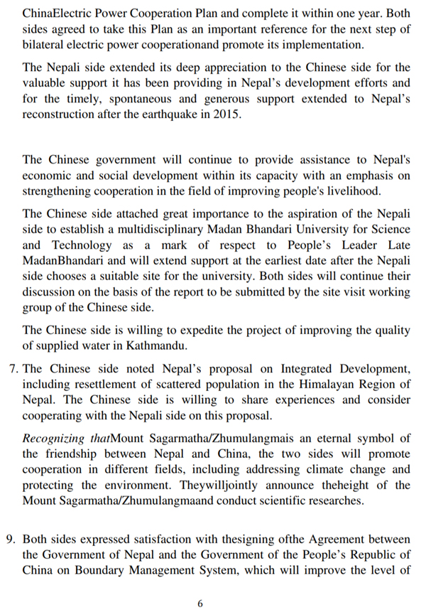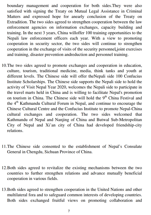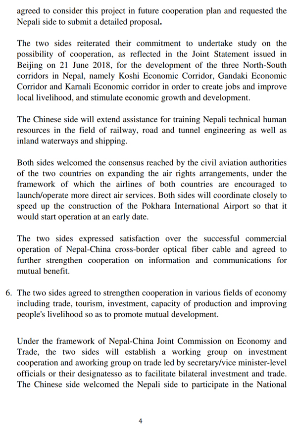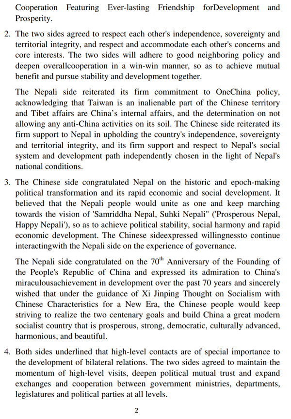 यसैगरी दुबै पक्षले राम्रो छिमेकी नीति अनुसरण गर्ने उल्लेख गर्दै नेपाली पक्षले एक चीन नीतिप्रति आफ्नो दृढ प्रतिबद्धता दोहो¥याएको छ ।