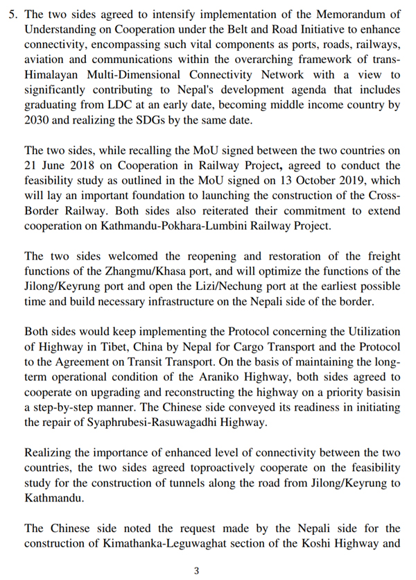 संयुक्त वक्तव्यमा नेपाल र चीनले बीआरआई महत्वका साथ उठाइएको छ । भने, दुबै पक्ष एकअर्काको स्वतन्त्रता, सार्वभौमिकताको सम्मान गर्न सहमत रहेको उल्लेख छ ।