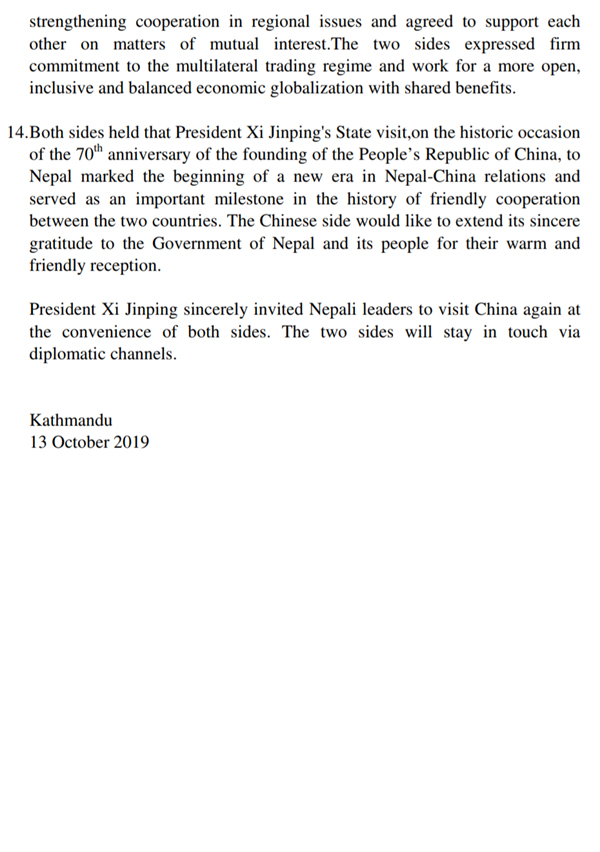 २६ असोज ०७६, काठमाडौं । राष्ट्रपति विद्यादेवी भण्डारीको निमन्त्रणामा दुईदिने राजकीय भ्रमणमा नेपाल आएका चिनियाँ राष्ट्रपति स्वदेशफर्किए लगतै १४ बुँदे संयुक्त वक्तव्य सार्वजनिक भएको छ ।