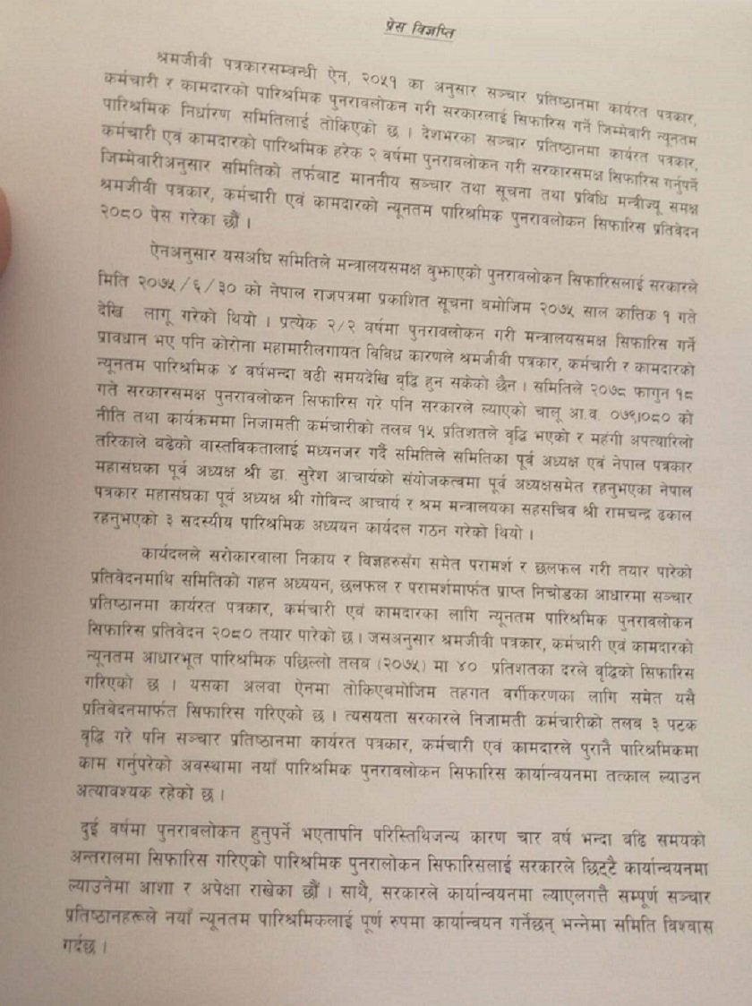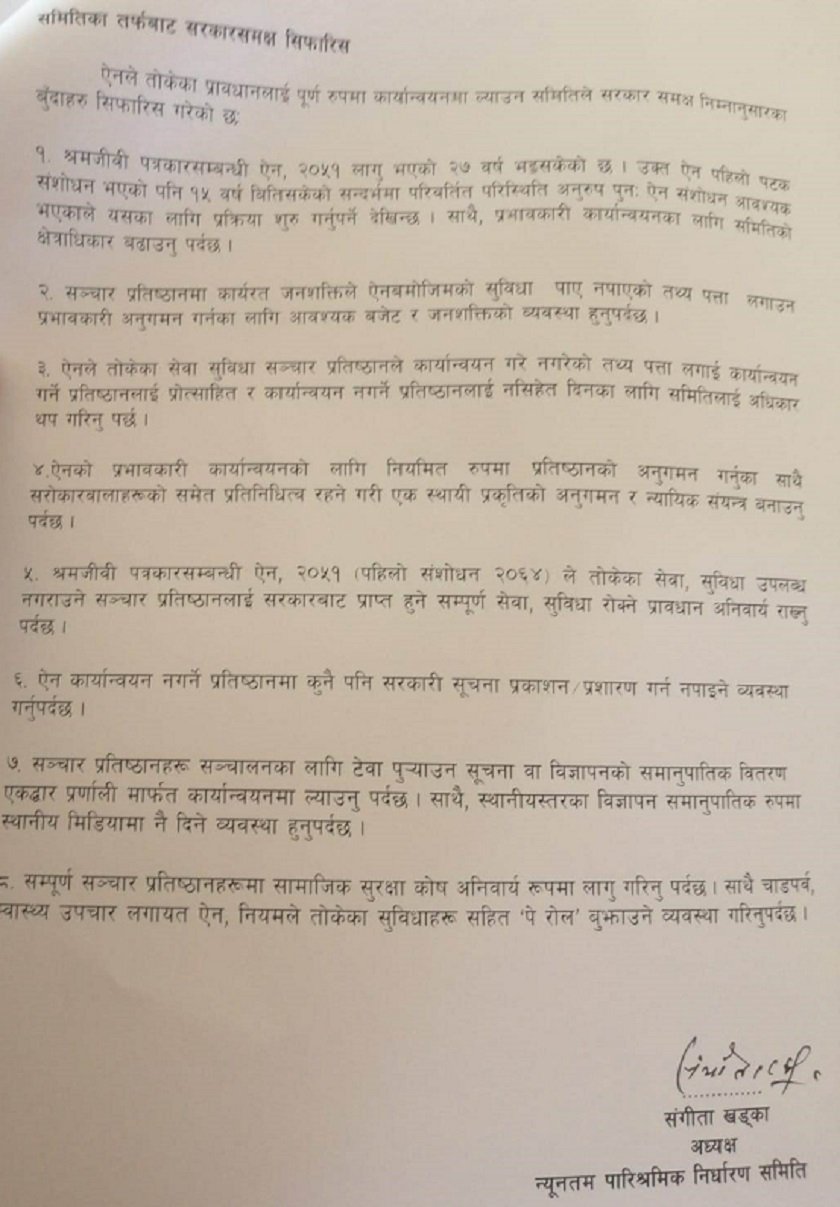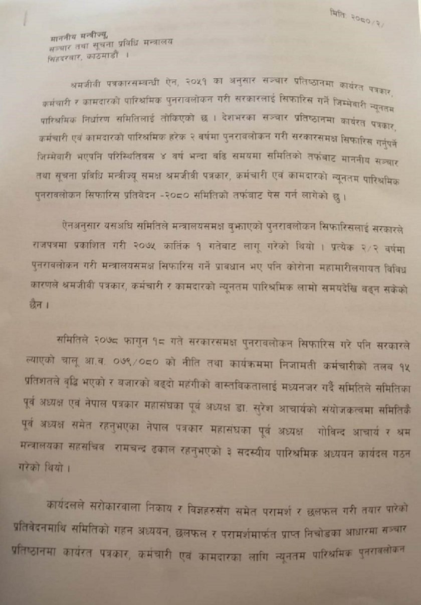 समितिले गरेको सिफारिसमा पाँचौ तहको ३७ हजार ५ सय ३८ रुपैया, बरिष्ठ संवाददाता, भाषा सम्पाक साथै सहायक सम्पादक वा सो सरहको पारिश्रमिक ४० हजार ९०० सय बनाउनुपर्ने प्रस्ताव गरेको छ ।