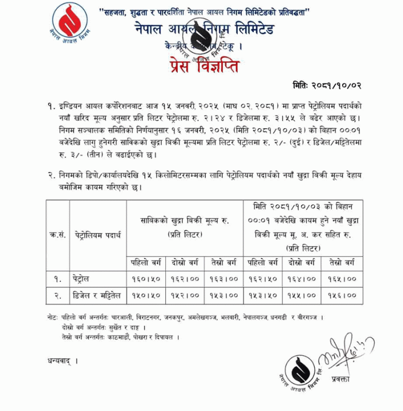 २ माघ ०८१, काठमाडौं । नेपाल आयल निगम लिमिटेडले पेट्रोलियम पदार्थको मूल्य बढाएको छ ।
