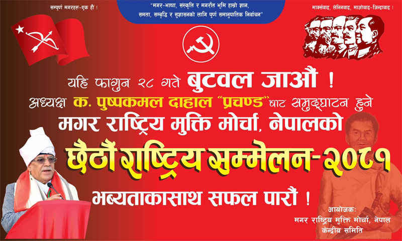 नेकपा (माओवादी केन्द्र) का अध्यक्ष पुष्पकमल दाहाल ‘प्रचण्ड’को प्रमुख आतिथ्यमा “मगर भाषा संस्कृति र मगराँत भूमि हाम्रो शान; समता, समृद्धि र सुशासनको लागि पूर्ण समानुपातिक निर्वाचन !” भन्ने मूलनाराका साथ भोलि बुधबार रुपन्देहीको बुटवलस्थित ट्राफिक चोकमा सम्मेलन उद्घाटन हुने भएको हो ।