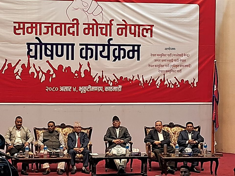 ४ असार ०८०, काठमाडौं । सरकारको नेतृत्व गरेको नेकपा (माओवादी केन्द्र)सहित चार दलले समाजवादी मोर्चा, नेपाल घोषणा गरेका छन् ।