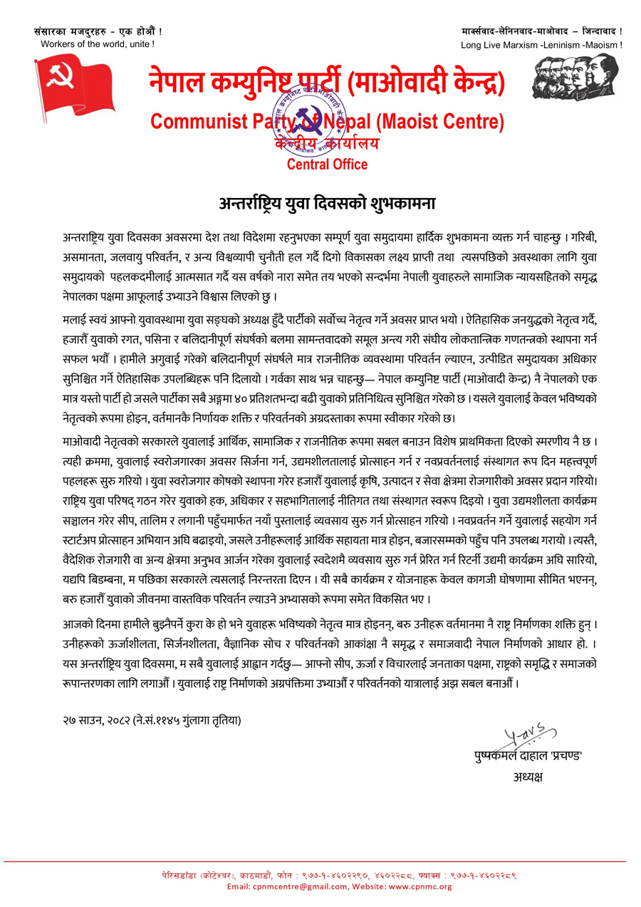 माओवादी नेतृत्वको सरकारले युवालाई आर्थिक, सामाजिक र राजनीतिक रूपमा सबल बनाउन विशेष प्राथमिकता दिएको उल्लेख गर्दै शुभकामनामा भनिएको छ, “आफ्नो सीप, ऊर्जा र विचारलाई जनताका पक्षमा, राष्ट्रको समृद्धि र समाजको रूपान्तरणका लागि लगाऔँ । युवालाई राष्ट्र निर्माणको अग्रपंक्तिमा उभ्याऔँ र परिवर्तनको यात्रालाई अझ सबल बनाऔँ ।”