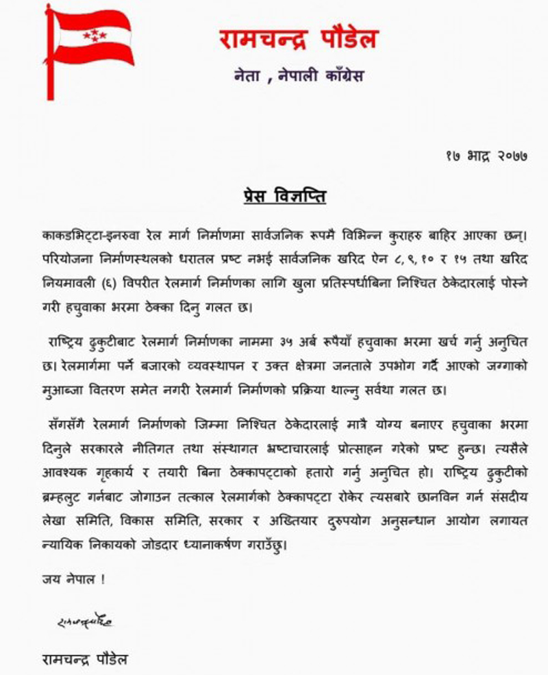 बुधबार एक विज्ञप्ति जारी गरी सार्वजनिक खरिद ऐन तथा खरिद नियमावली विपरीत रेलमार्ग निर्माणका नाममा ३५ अर्ब रुपैयाँ हचुवाको भरमा खर्च गरिनु अनुचित रहेको उल्लेख गर्दै नेता पौडेलले ठेक्कापट्टा रोकेर संसदीय लेखा समिति, विकास समिति, सरकार र अख्तियार लगायत न्यायिक निकायबाट छानबिन गर्नु पर्ने बताएका हुन् ।