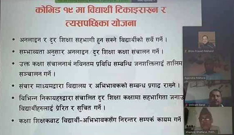 दूरशिक्षालाई थप व्यवस्थित गर्न सूचनाप्रविधि सामग्री खरिद गरिएको, शिक्षकहरुलाई सूचनाप्रविधिमैत्री तालिम सञ्चालन गरिएको साथै, अनलाइन, रेडियो, टेलिभिजनको पहुँचमा नभएका विद्यार्थीका लागि सिकाइ सहजीकरण मिलाउन स्थानीय तहसँगछलफल चलिरहेको प्रअ खरेलले जानकारी दिए ।