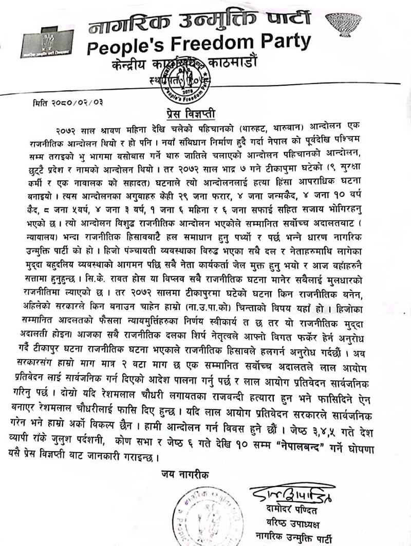 पार्टीका वरिष्ठ उपाध्यक्ष दामोदर पण्दितले हस्ताक्षर गरेको विज्ञप्तिमा भनिएको छ, ‘यदि लाल आयोगको प्रतिवेदन सरकारले सार्वजनिक गरेन भने हाम्रो अर्को विकल्प छैन । हामी आन्दोलन गर्न विवश हुनेछौं । जेठ ३, ४, ५ गते देशब्यापी राँके जुलुस प्रदर्शनी कोणसभा र जेष्ठ ६ गतेदेखि १० गतेसम्म नेपालबन्द गर्ने घोषणा यसै प्रेस विज्ञप्तिबाट जानकारी गराइन्छ ।’