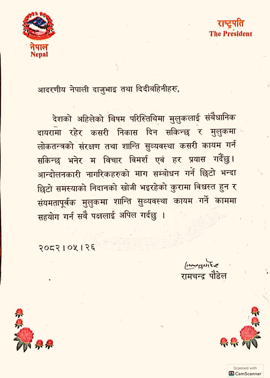 राष्ट्रपति पौडेलले बिहीबार एक विज्ञप्ति जारी गर्दै संयमतापूर्वक मुलुकमा शान्ति सुव्यवस्था कायम गर्ने काममा सहयोग गर्न सबै पक्षलाई अपिल गर्दै यस्तो बताएका हुन् ।