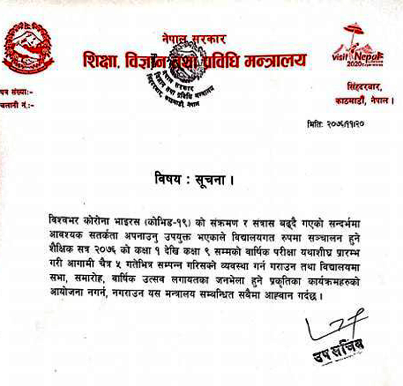 शिक्षा मन्त्रालयले कक्षा १ देखि ९ सम्मको परीक्षा चैत ५ गतेभित्र सक्नु पर्ने विद्यालयमा सभा, समारोह र वार्षिक उत्सव जस्ता सर्वसाधारण भेला हुने कार्यक्रम नराख्न समेत अनुरोध गरेको छ ।