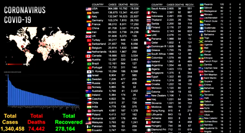 विश्वभर कोरोना भाइरसबाट ७४ हजार ४ सय भन्दा बढीको मृत्यु