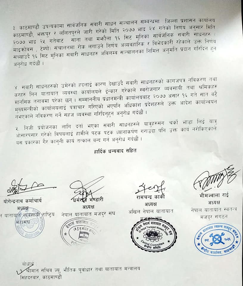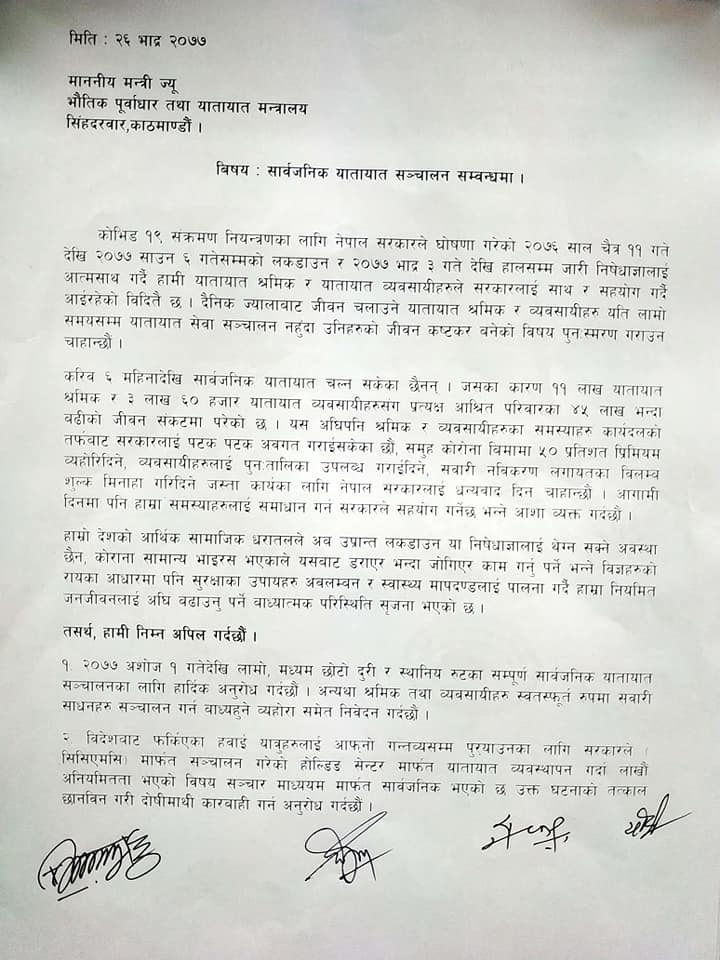 “करिब ६ महिनादेखि सार्वजनिक यातायात चल्न सकेका छैनन । जसका कारण ११ लाख यातायात श्रमिक र ३ लाख ६० हजार यातायात व्यवसायीहरूसँग प्रत्यक्ष आश्रित परिवारका ४५ लाख भन्दा बढीको जीवन संकटमा परेको छ,” पत्रमा भनिएको छ, “जिल्ला प्रशासन कायालय काठमाडौं, भक्तपुर र ललितपुरले जारी गरेको मिति २०७७ भाद २४ गतेको निर्णय अनुसार १६ सिट मुनिका सार्वजनिक सवारी साधनहरू माइक्रोबस, टेम्पो संचालनमा रोक लगाउने निर्णय अव्यवहारिक र विभेदकारी रहेकाले उक्त निर्णय सच्याउँदै १६ सिट मुनिका सवारी साधनहरु अबिलम्ब सञ्चालन अनुमति प्रदान गरिदन हुन अनुरोध गर्दछौं ।”