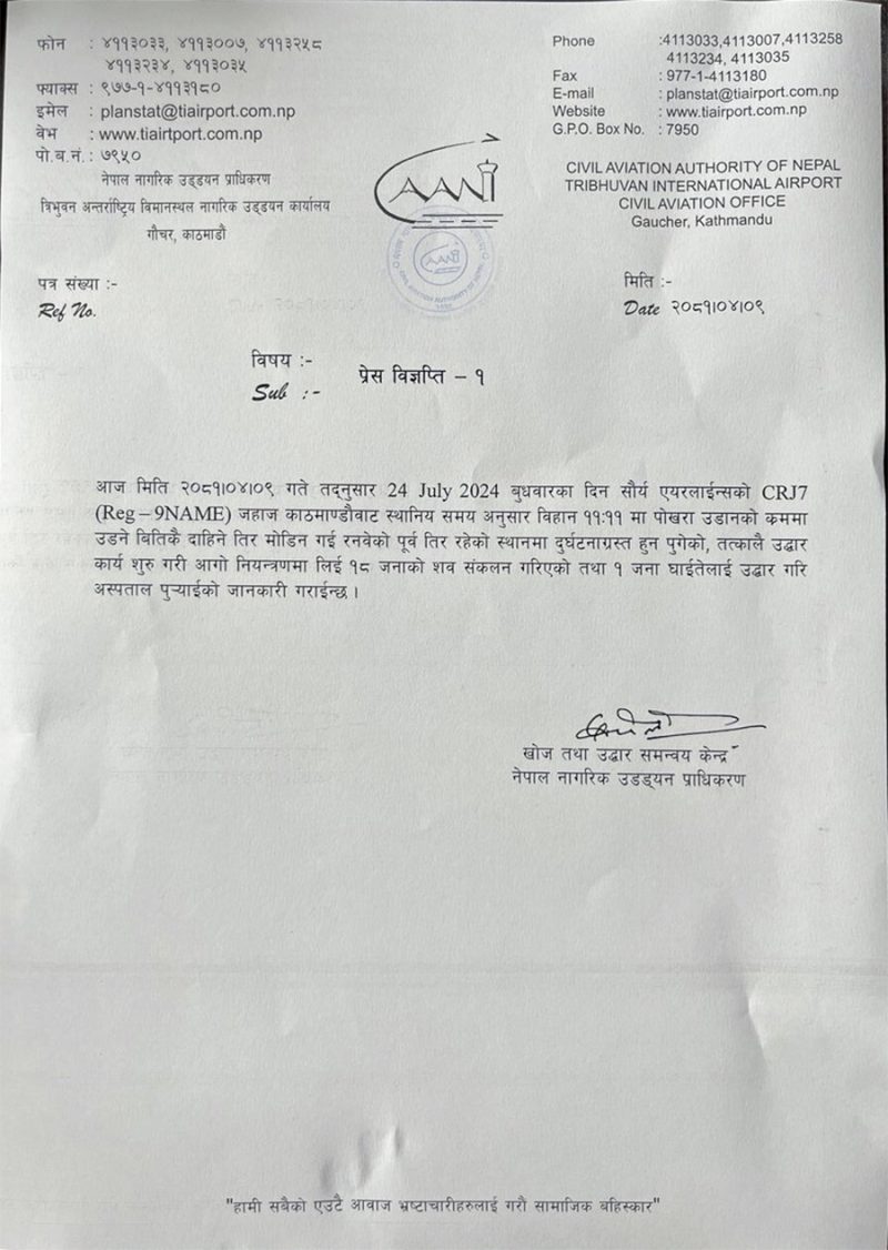 उक्त दुर्घटनामा १८ जनाको मृत्यु हुनुका साथै एक जना घाइते भएको नेपाल नागरिक उड्डयन प्राधिकरणले जनाएको छ ।
